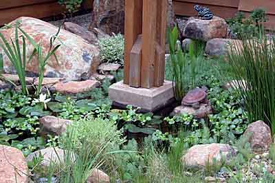 | The entry to this Poway home passes over a stream and pond surrounded by native woodland plants. | This is a close up of the water feature in the entry. | |